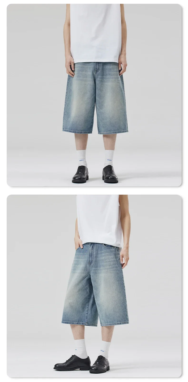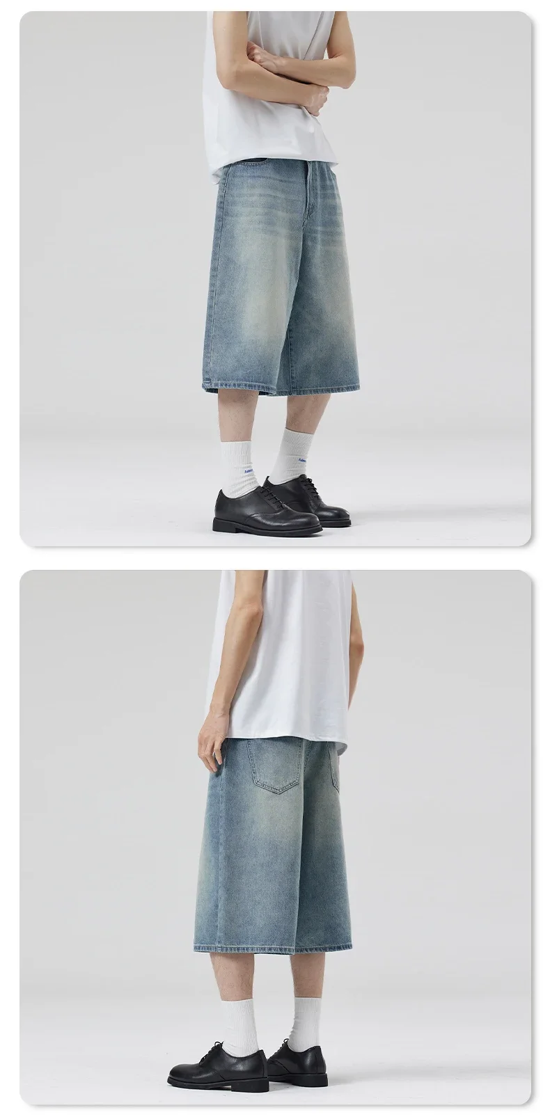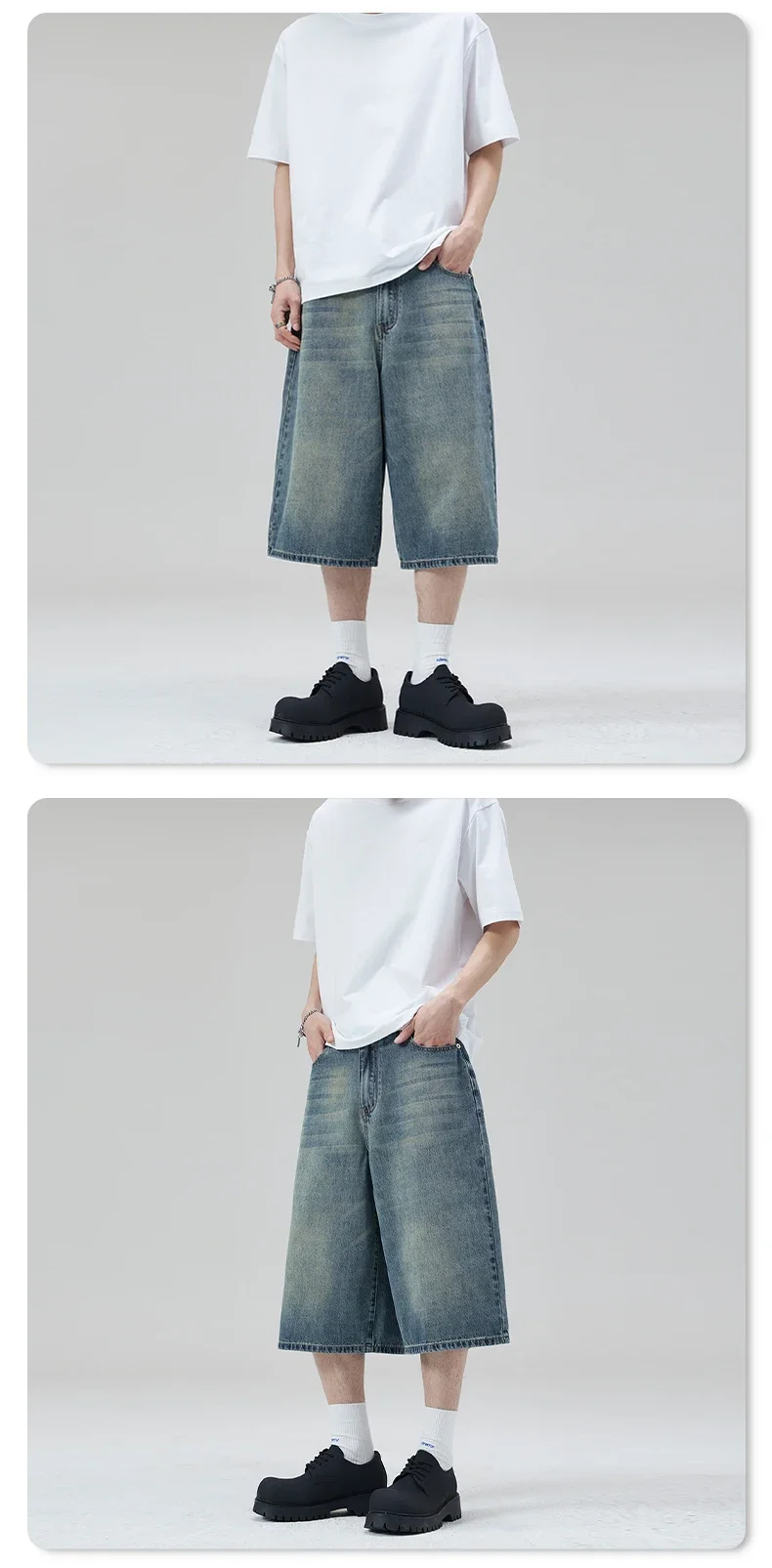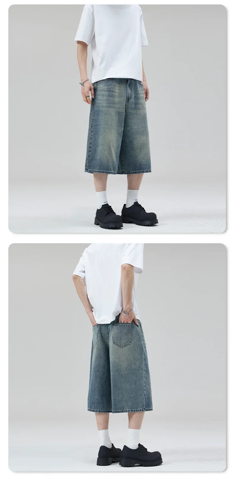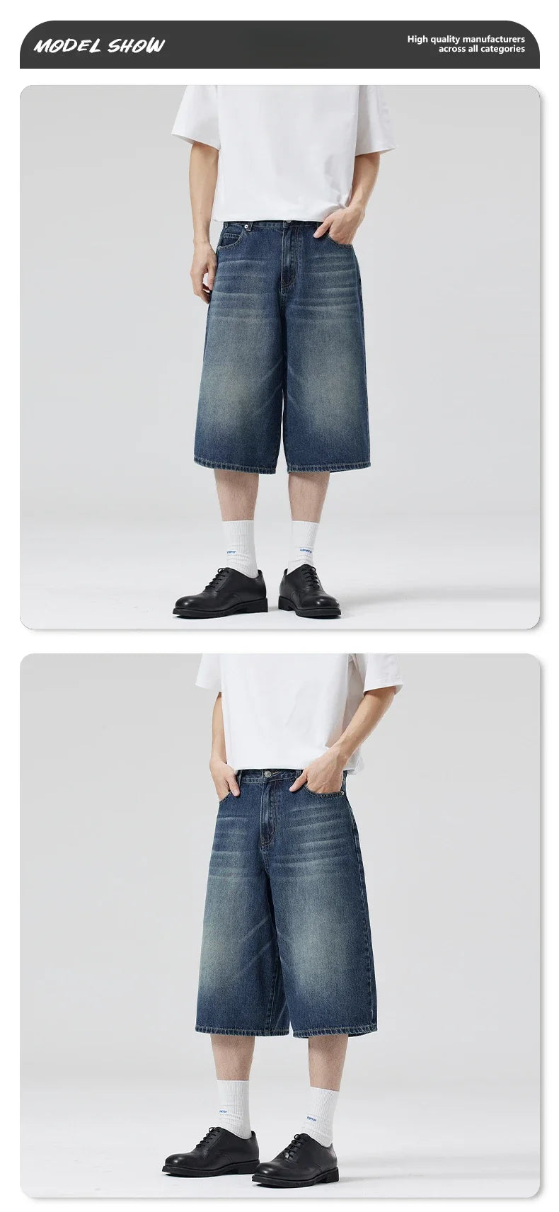 2025 Summer American Lightning Crack Denim Cropped Pants Men's Straight Loose Wide-leg Shorts Street Baggy Casual Pants
