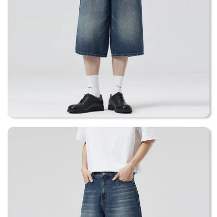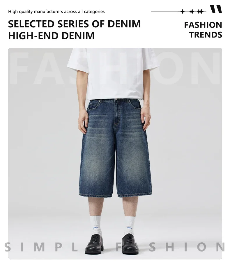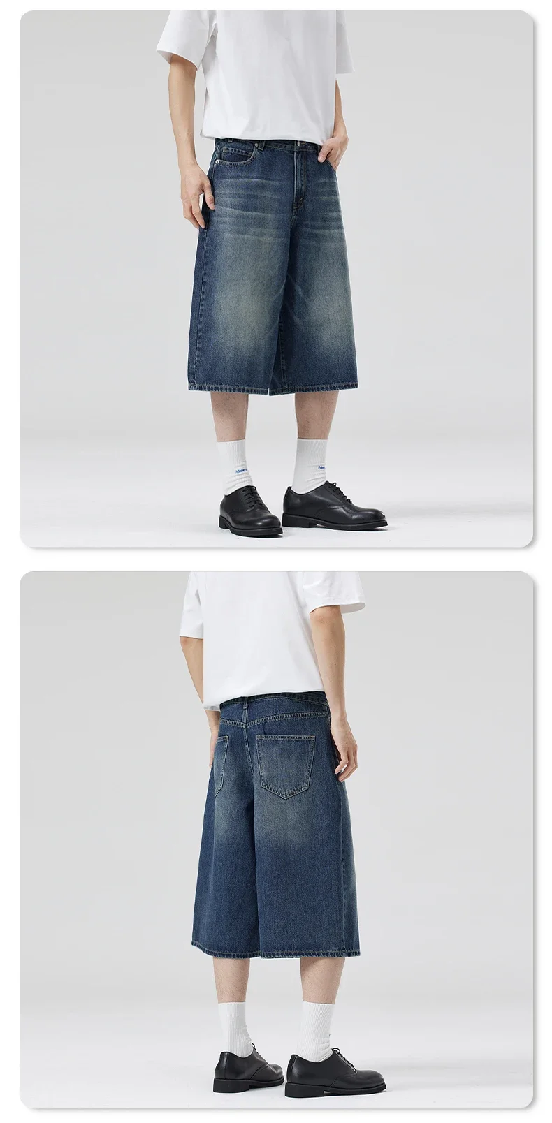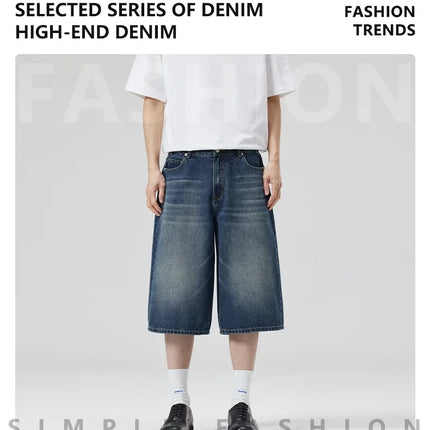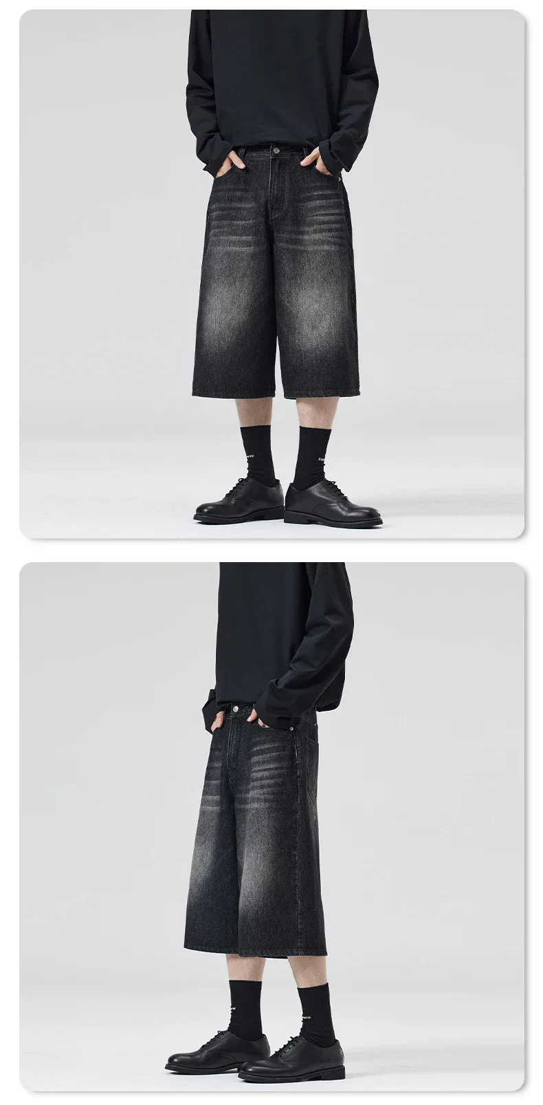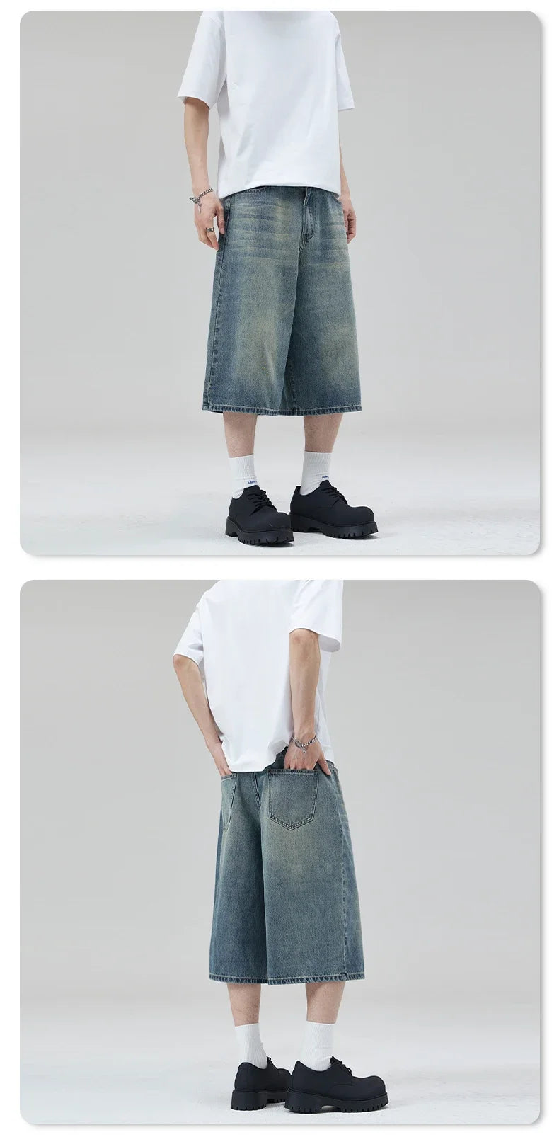 2025 Summer American Lightning Crack Denim Cropped Pants Men's Straight Loose Wide-leg Shorts Street Baggy Casual Pants