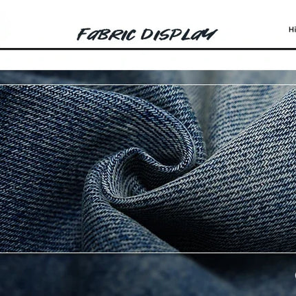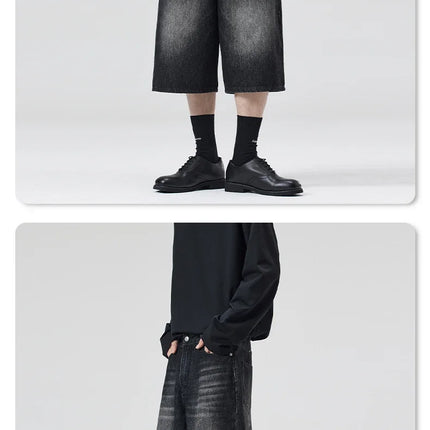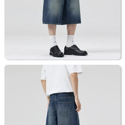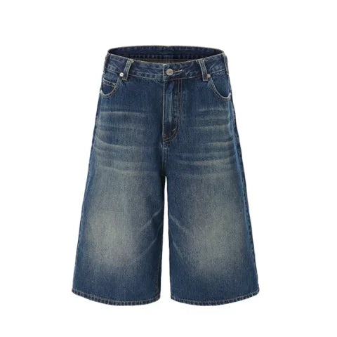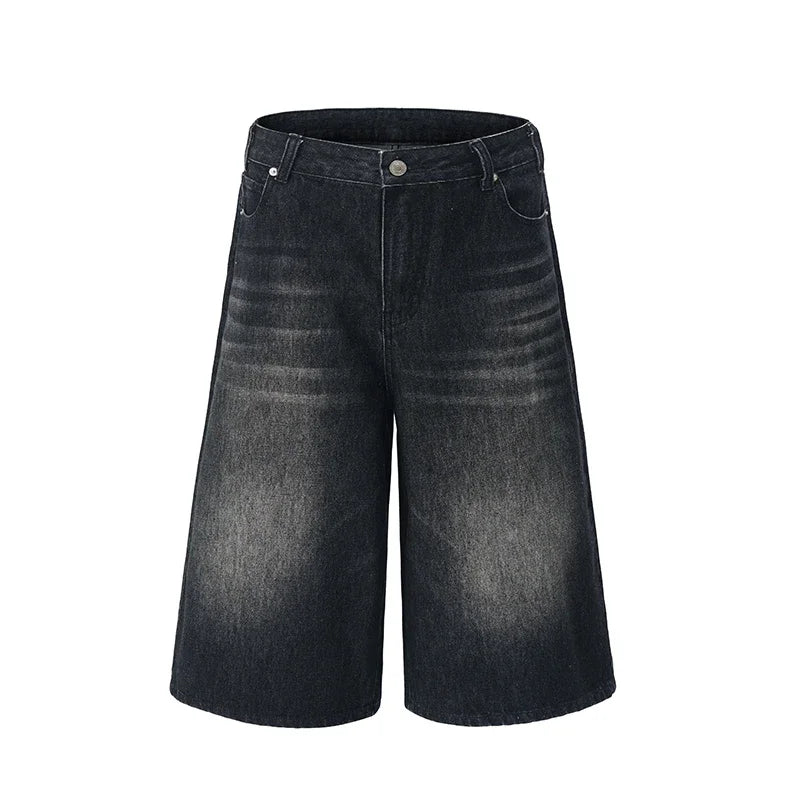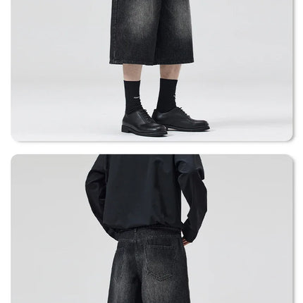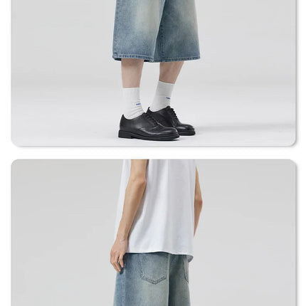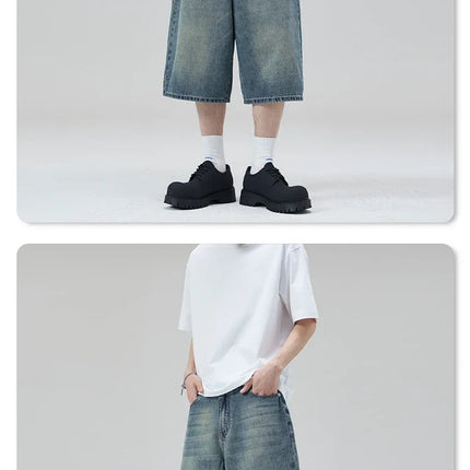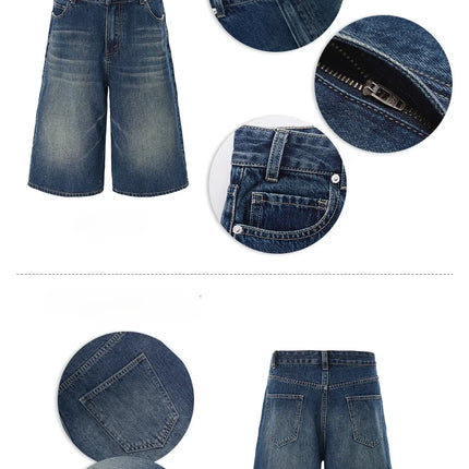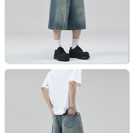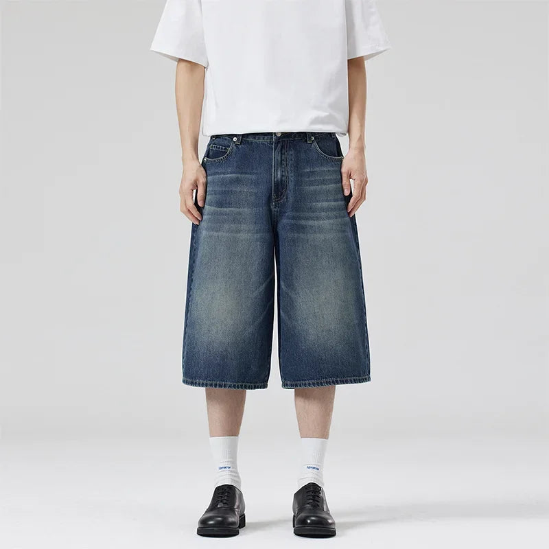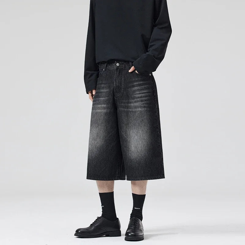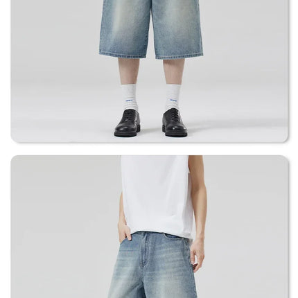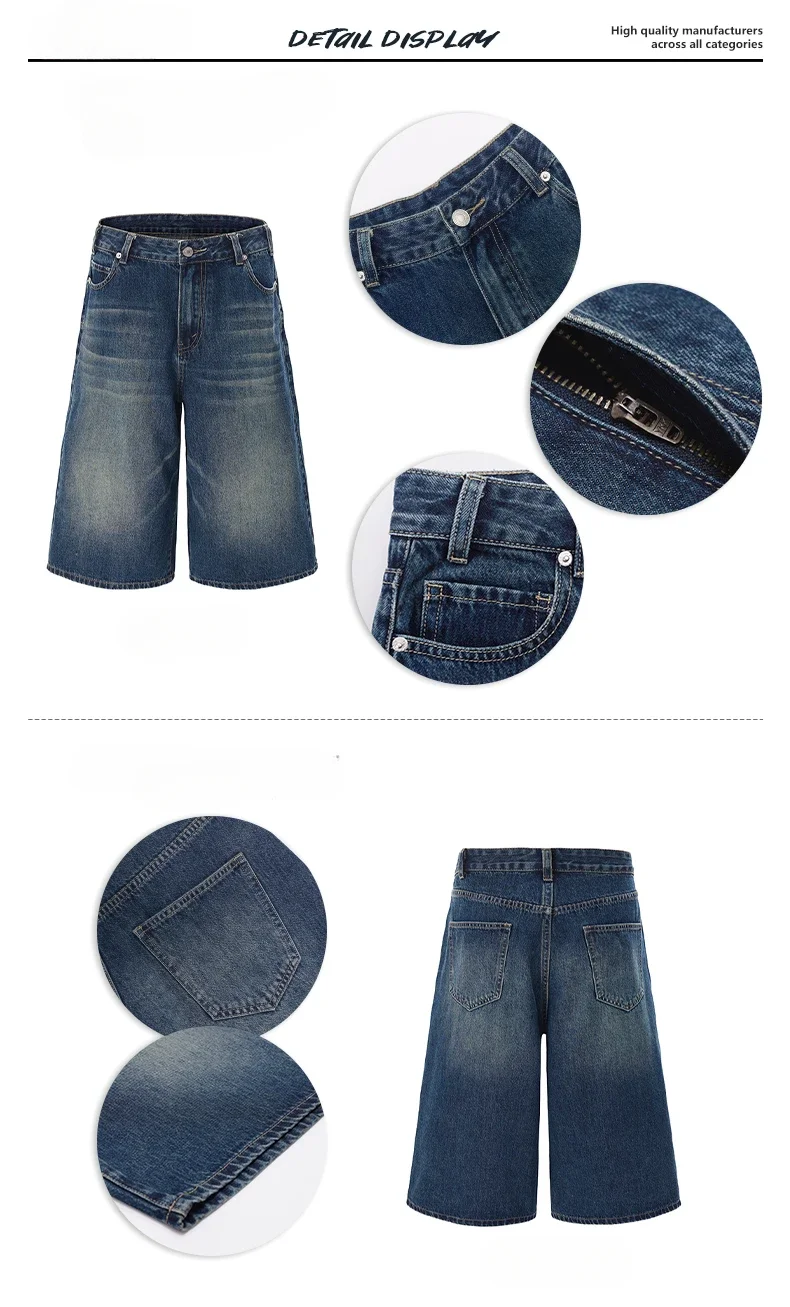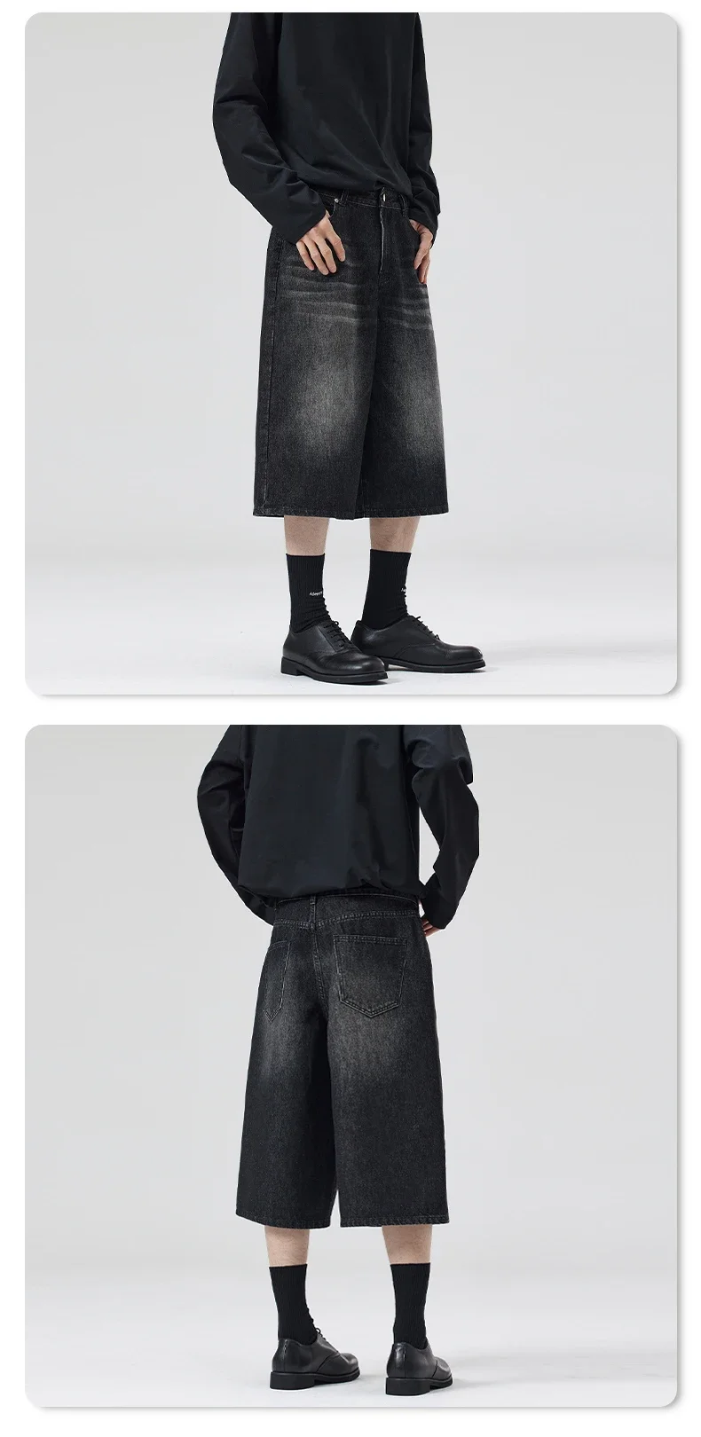 2025 Summer American Lightning Crack Denim Cropped Pants Men's Straight Loose Wide-leg Shorts Street Baggy Casual Pants