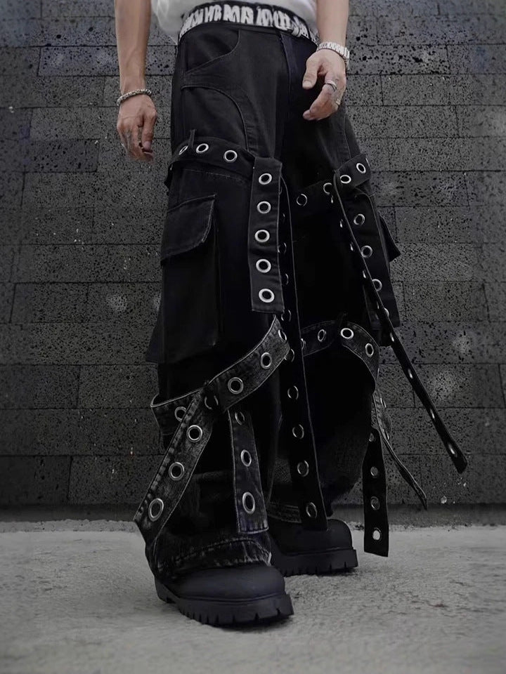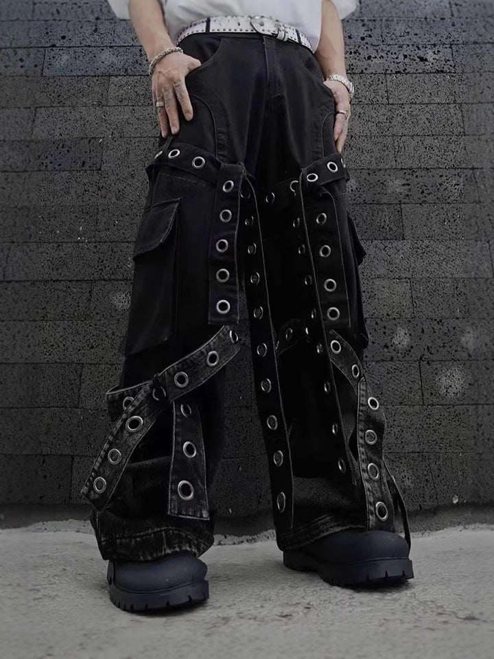 American street retro heavy industry design sense pleated workwear hardware decoration loose drape jeans for men and women
