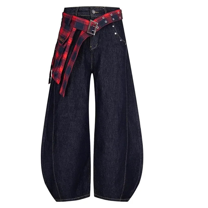 TALKLESS Washed Plaid Belt Barrel Jeans—5227