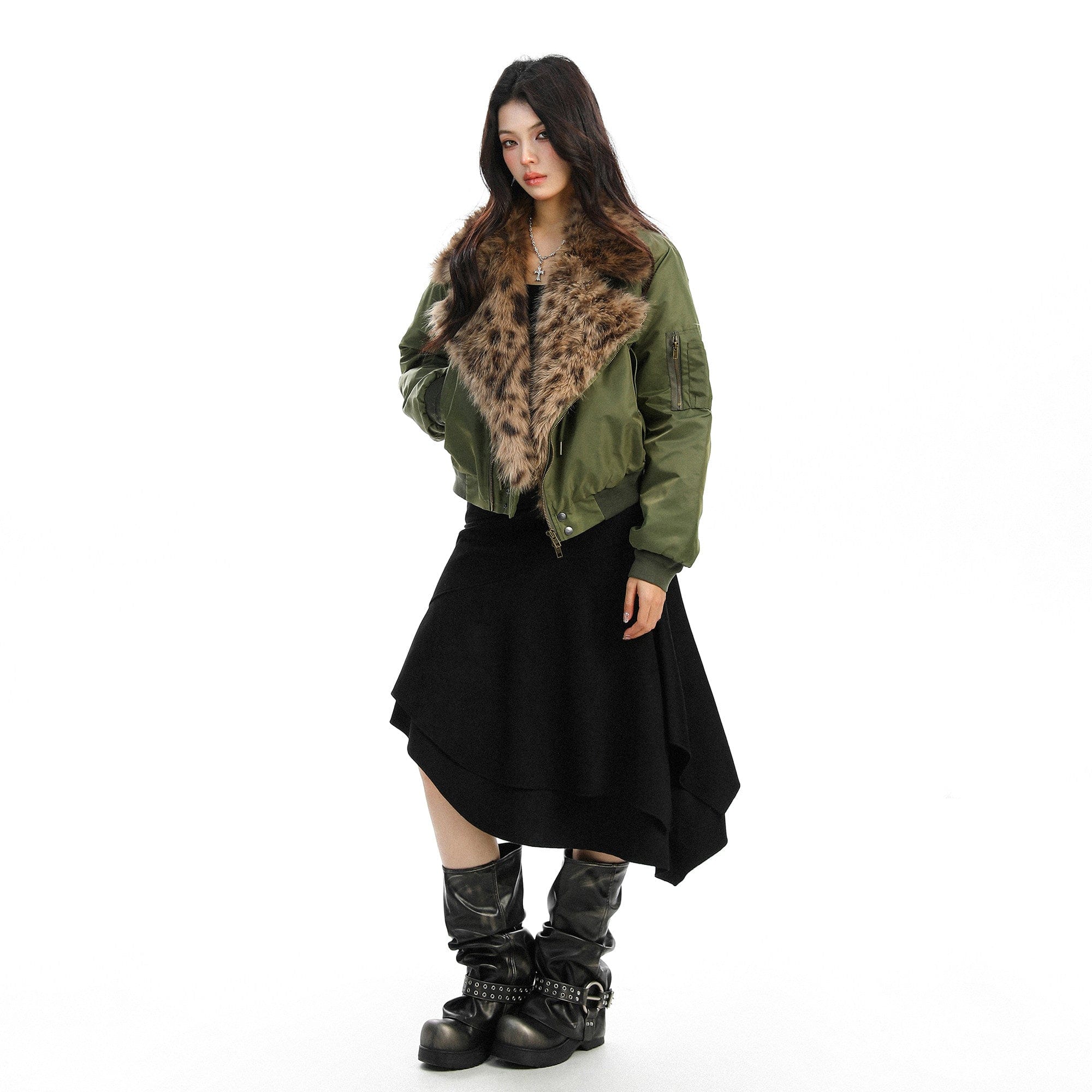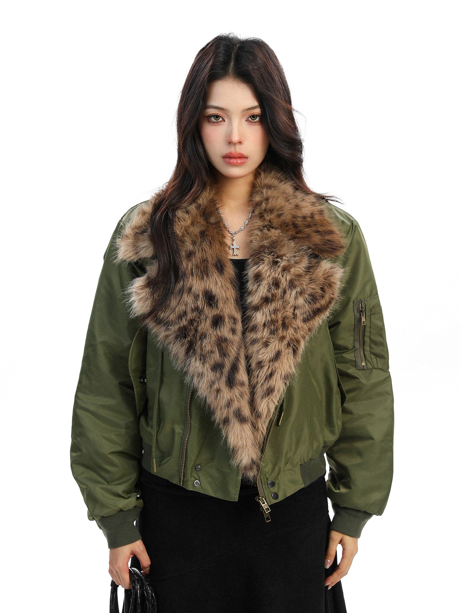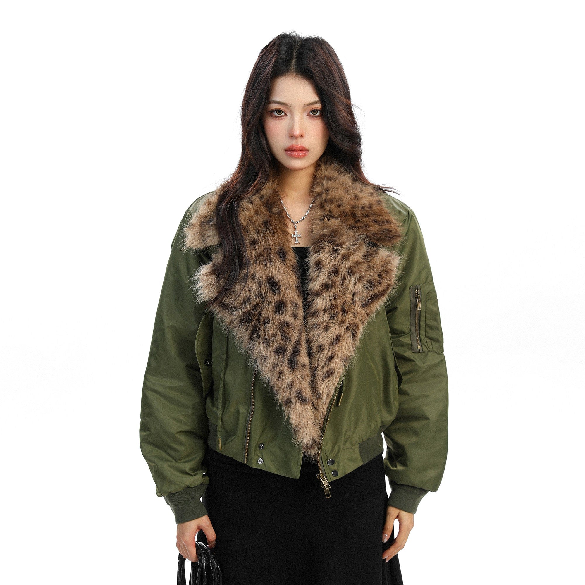 Leopard-Collar Motor-Core Padded Jacket