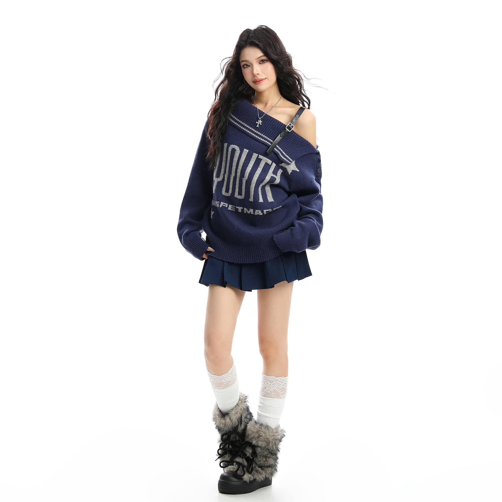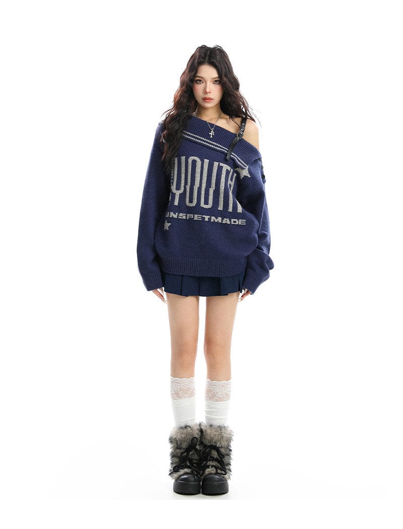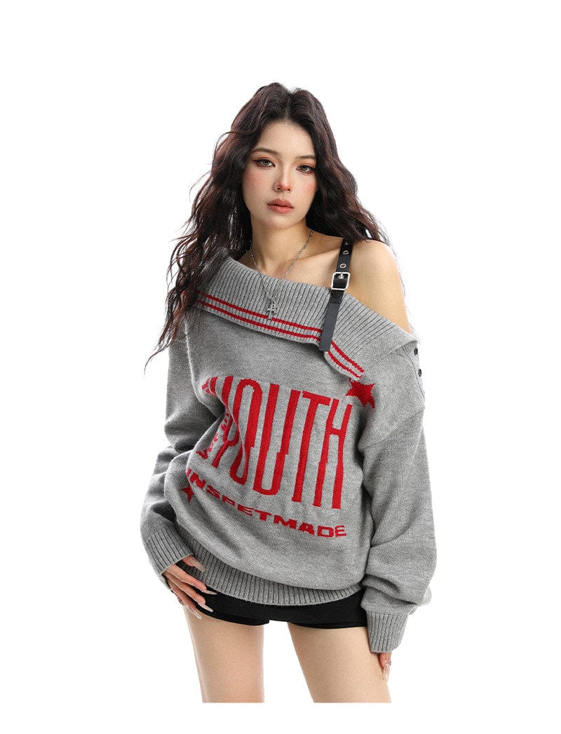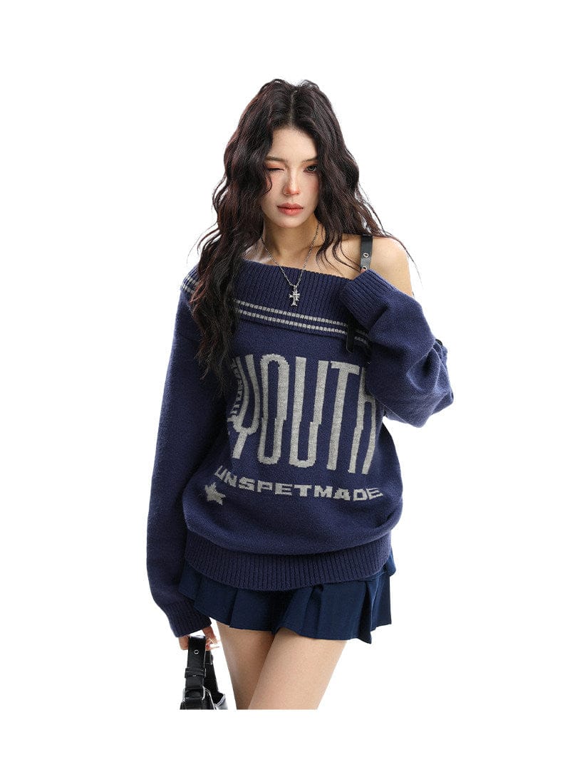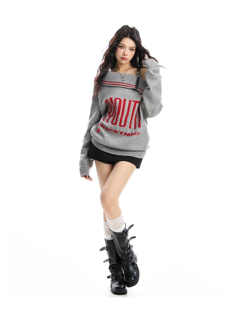 BIGGOLD American letter design slanted shoulder sweater women's autumn and winter thickened warm off-the-shoulder knit top trend