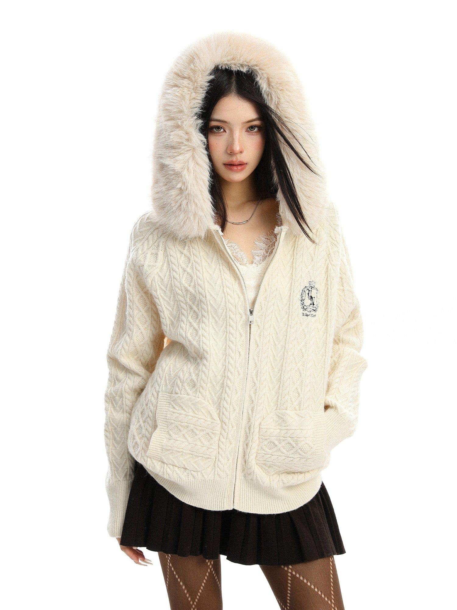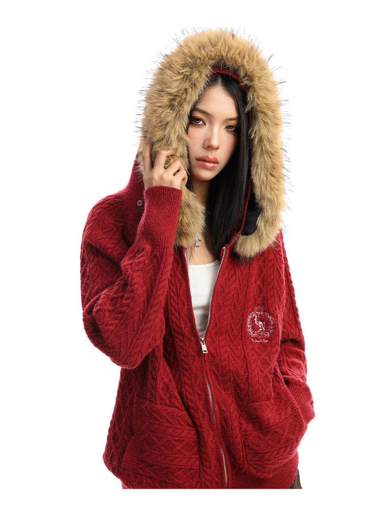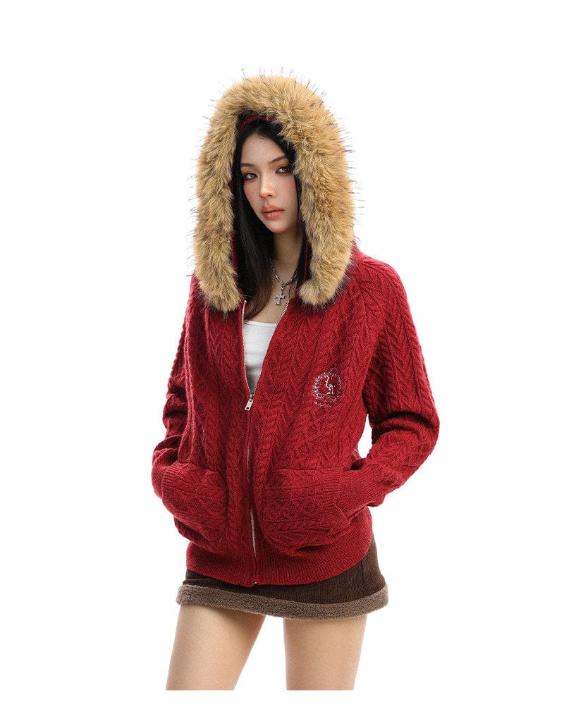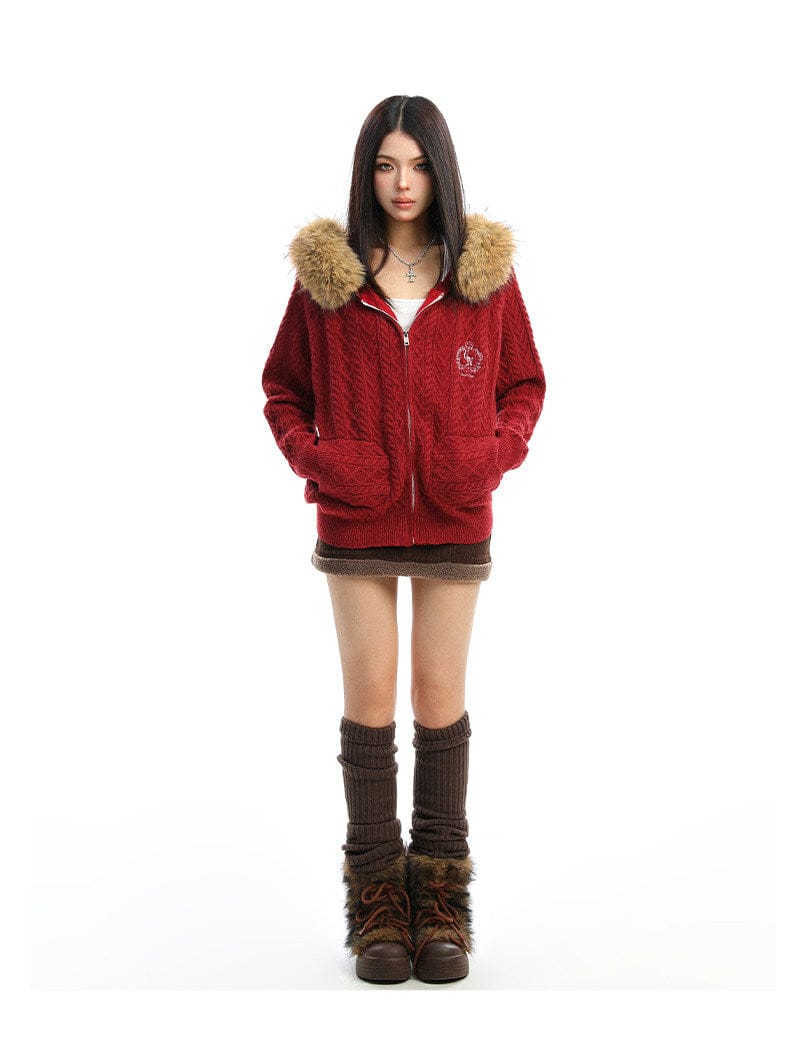 BIGGOLD Christmas and New Year fur collar hooded red sweater women's autumn and winter atmosphere warm knitted cardigan top