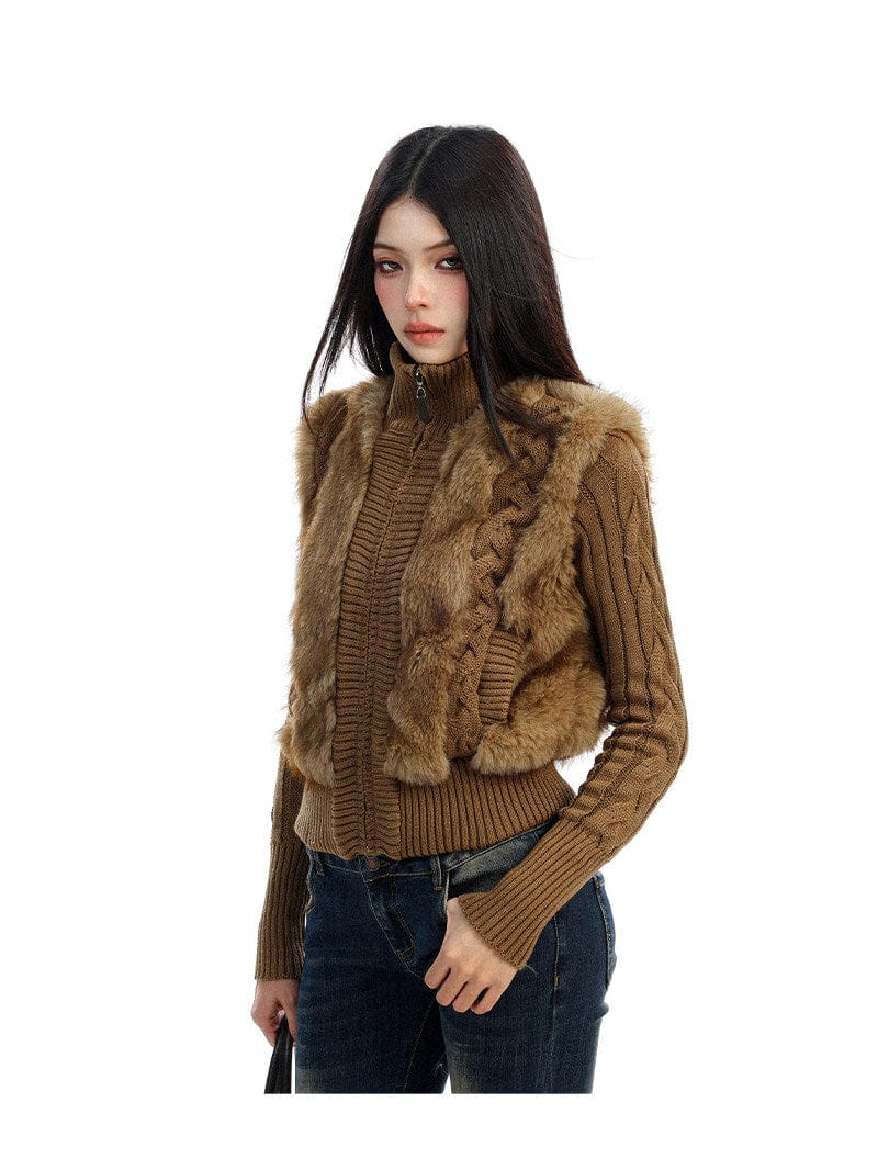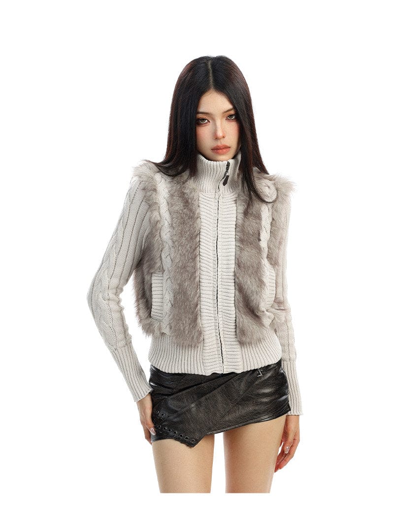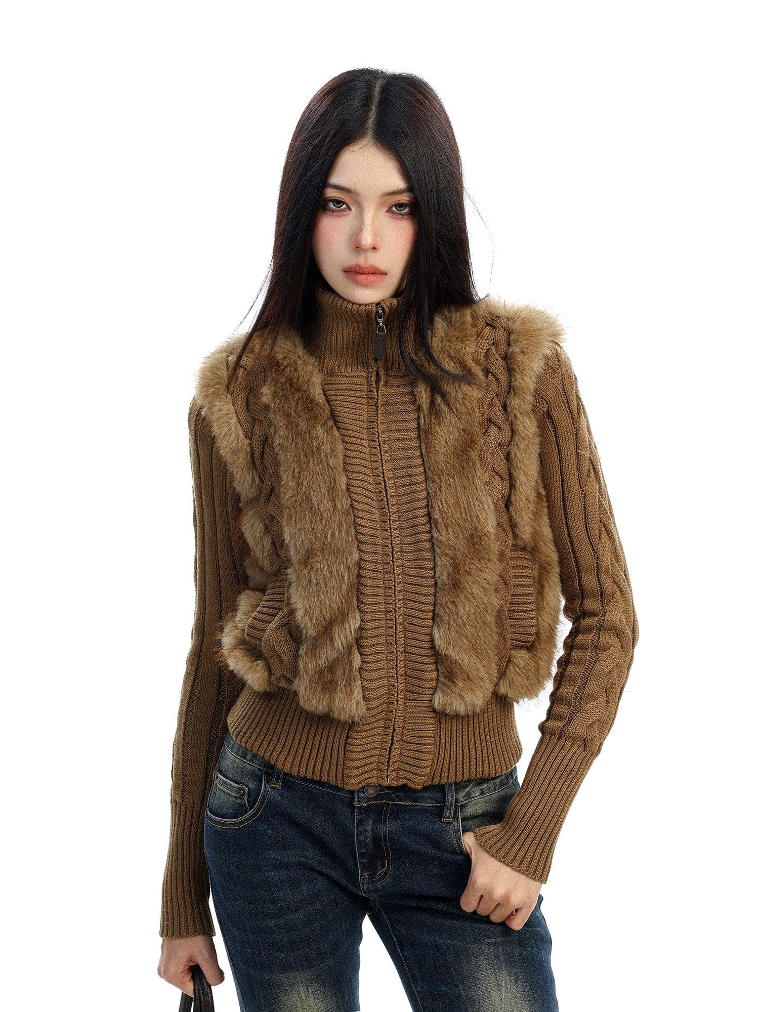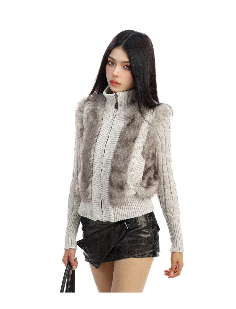 BIGGOLD Eco-friendly Fur Patchwork Stand Collar Twist Sweater Women's Autumn and Winter Slim Slimming Warm Knitwear Jacket