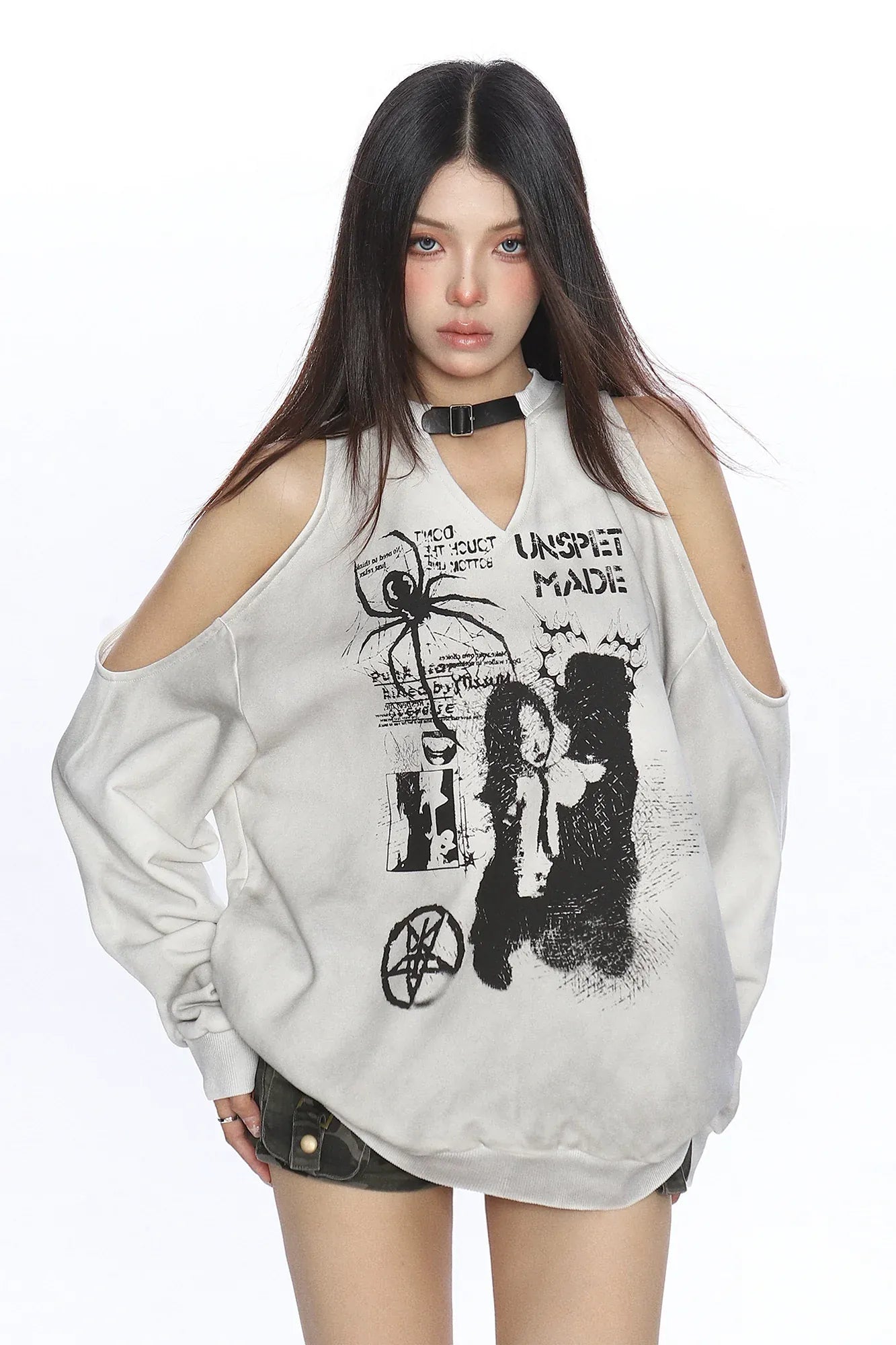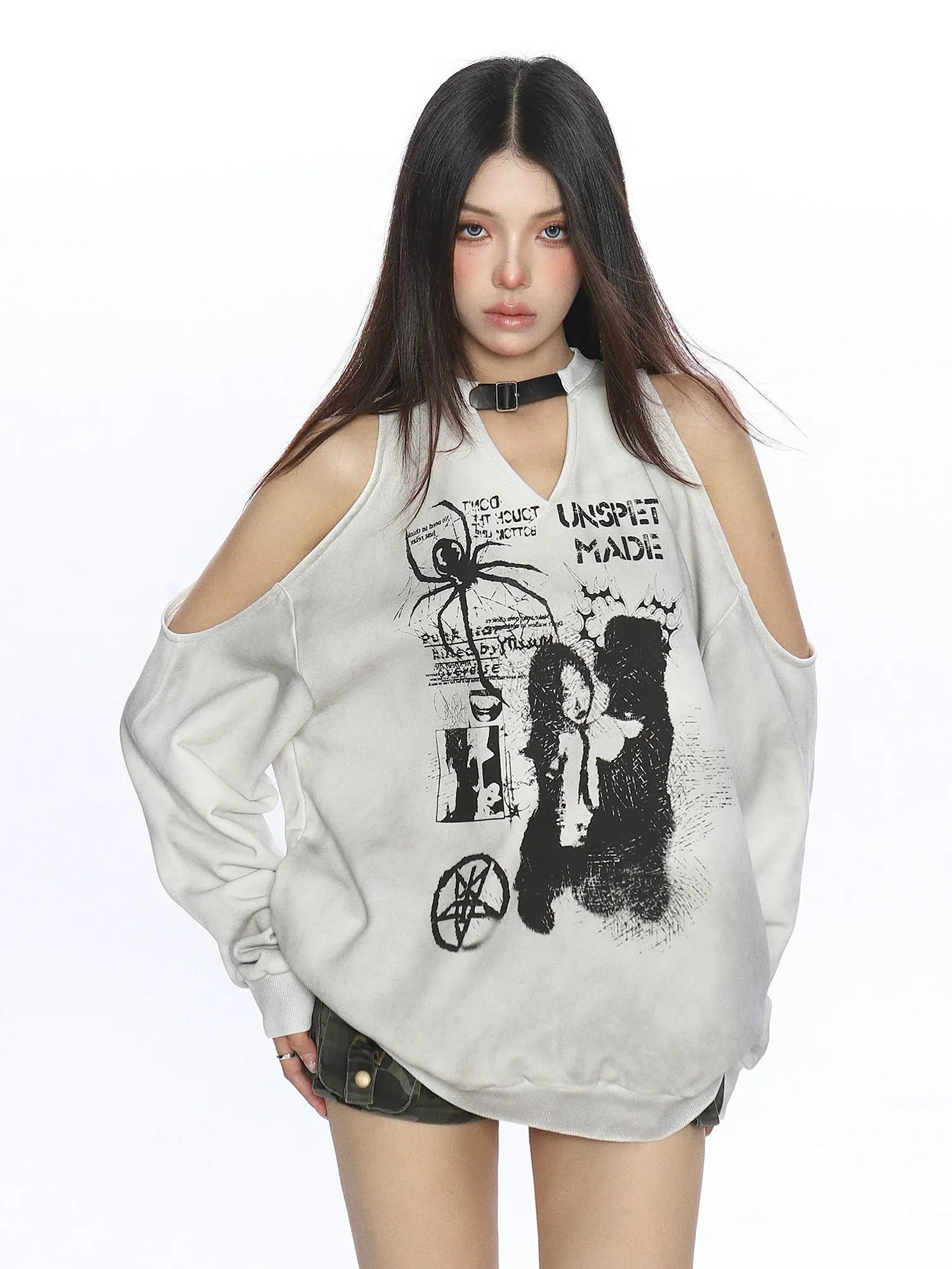 Graffiti Distressed Off-Shoulder Sweatshirt