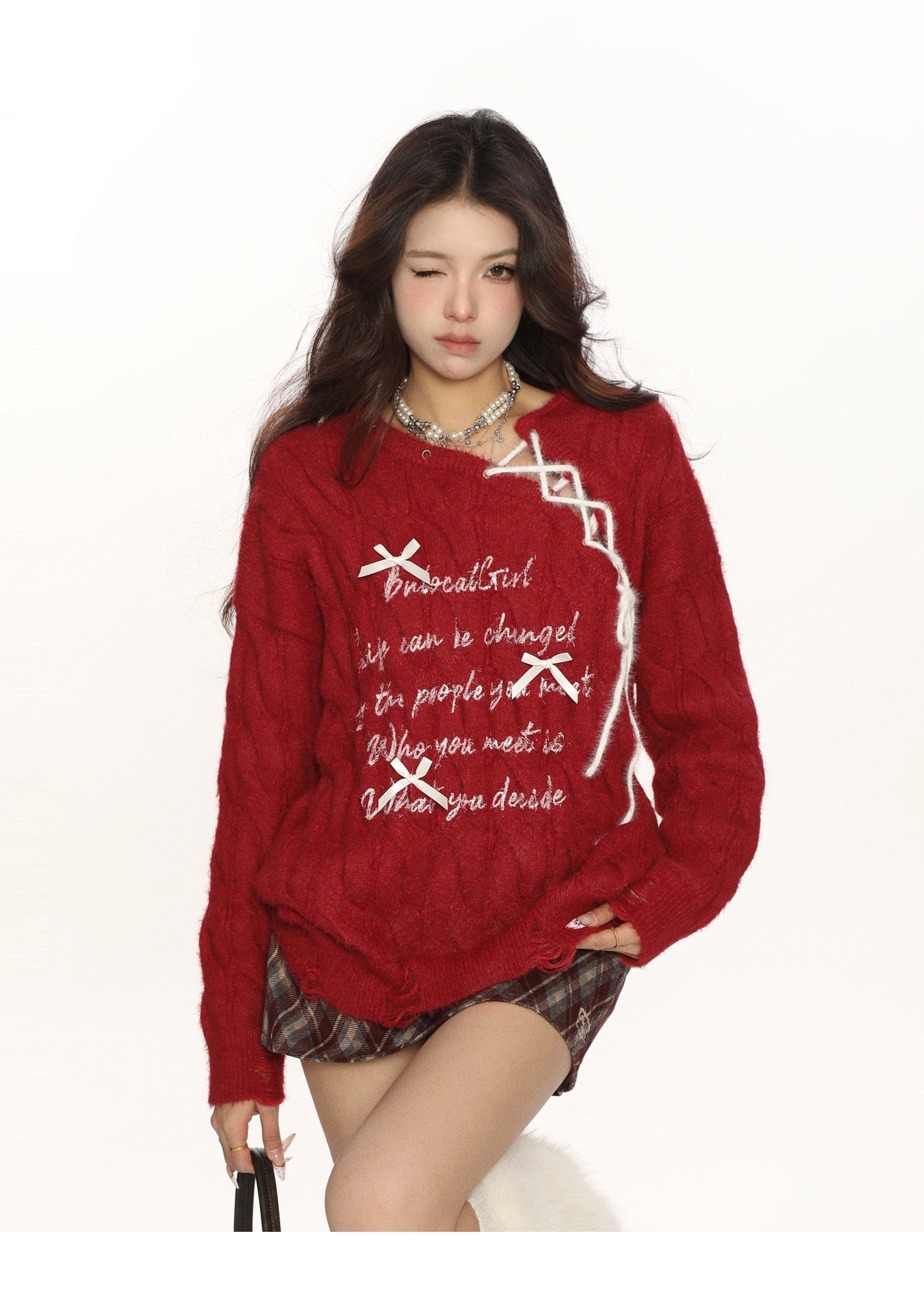 BIGGOLD Red New Year's Jersey Bow Tie Sweater Women's Autumn and Winter Lazy Wind Soft Waxy Knit Top