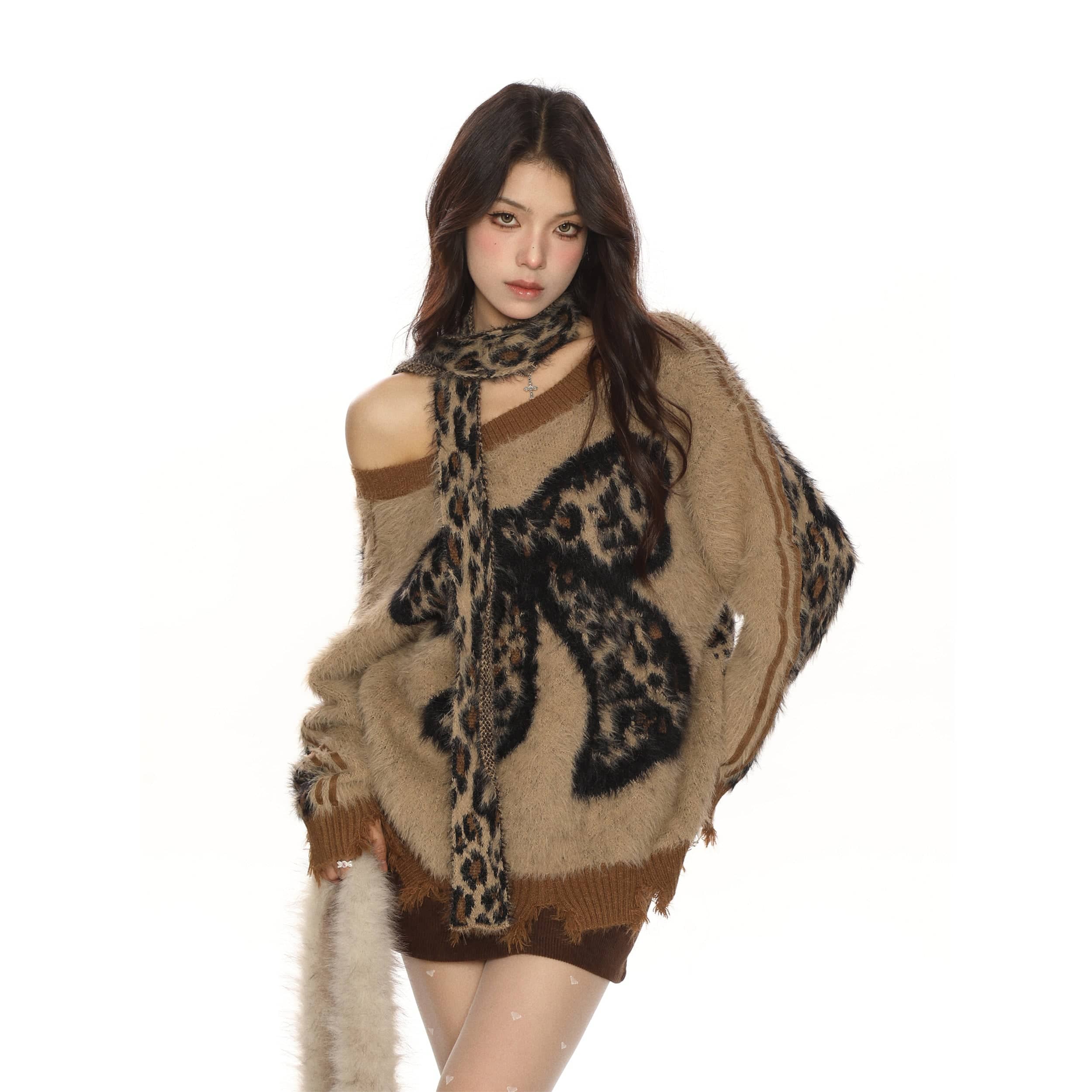 BIGGOLD sweet cool slanted shoulder leopard print bow soft glut sweater women's autumn and winter lazy style reversible knitwear trend